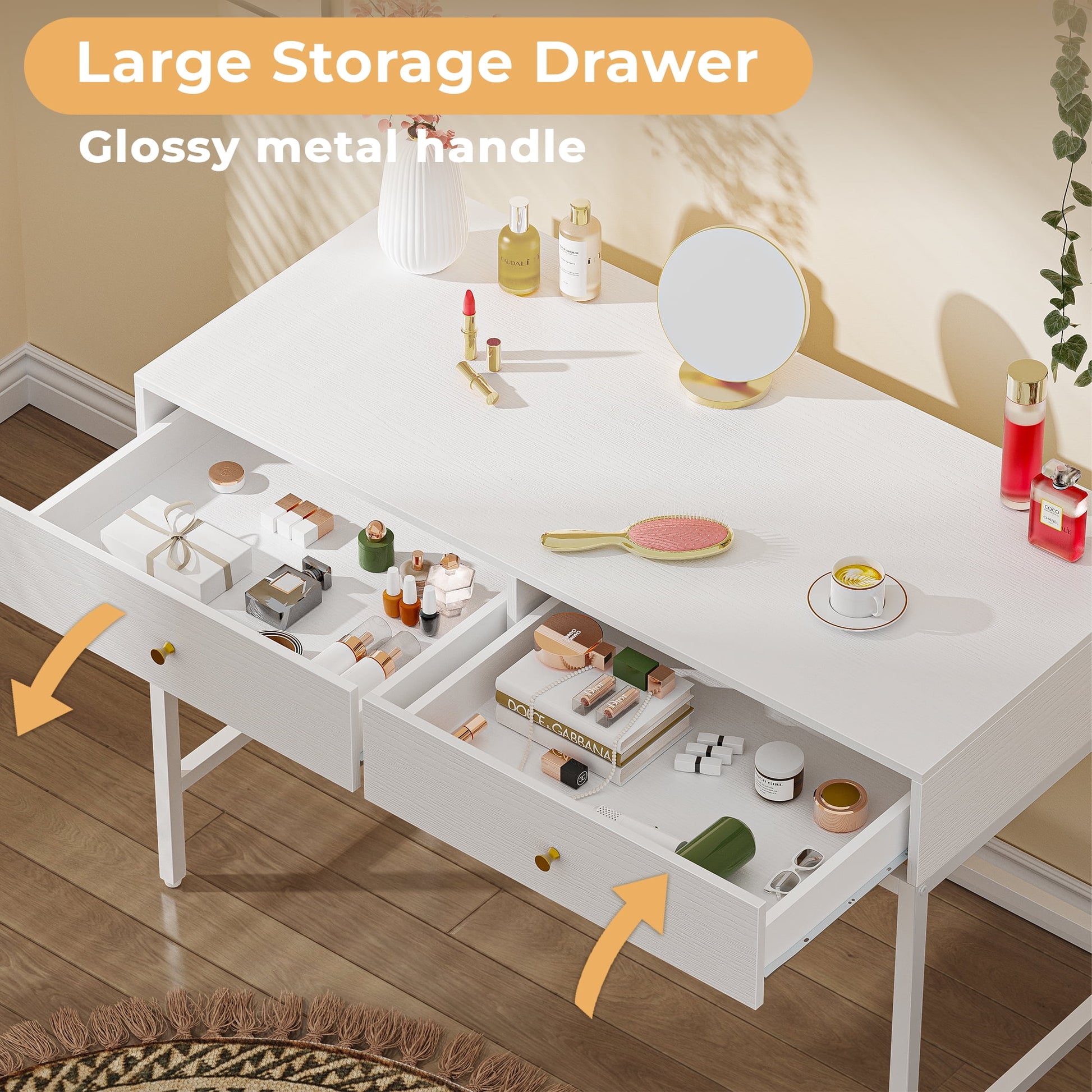 Give your makeup routines more joy with this white and gold makeup vanity. 2 spacious drawers on the white vanity desk organize your makeup items and bedside supplies well. Place this girls makeup vanity against your wall to optimize your bedroom space and give your jewellery hidden storage space. And also, the white finish combines well with the golden metal legs, this vanity table states an elegant and luxurious vibe in any bedroom it will stay. Adjustable feet let this white makeup vanity keep balanced on the floor and protect floors from scratches. At the same time, this modern vanity desk can also be an excellent home office desk and computer desk in your living room or study room, spacious desktop and 2 large drawers accommodate all your books, magazines and other office items. The elegant style of the dressing table will also upgrade your living room ambience.