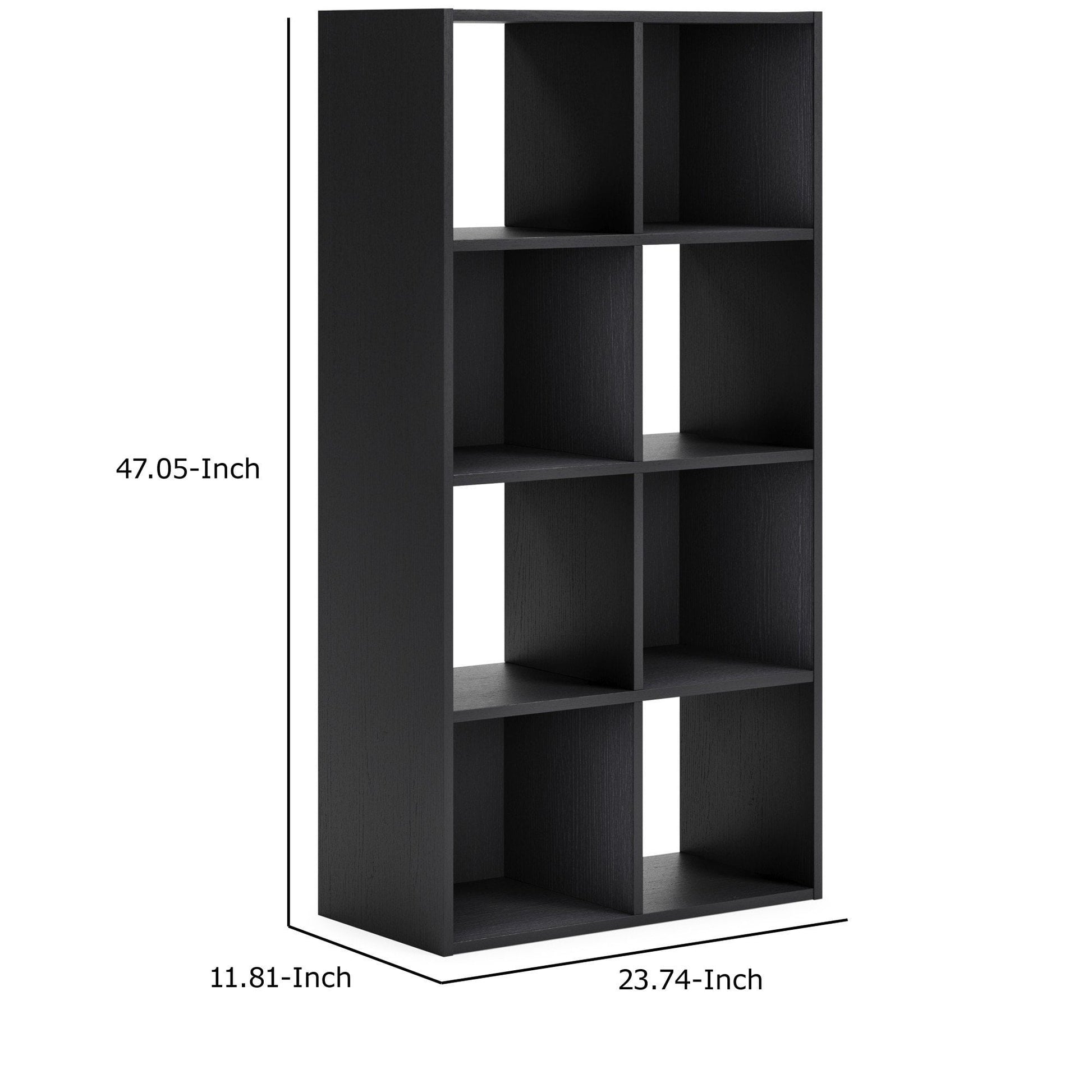 Zayla 48 Inch Tall Wood Bookcase Organizer 8 Cube Compartments Black - Saltoro Sherpi Masterfully crafted from premium composite wood with a laminate finish this eight cube bookcase is guaranteed to stand out in any living room or bedroom. A sleek eye catching cubed design split into eight compartments and finished in matte black with a wood grain texture makes this a striking addition to any contemporary living room or lounge. Check out our Zayla collection for matching items.